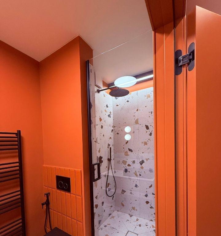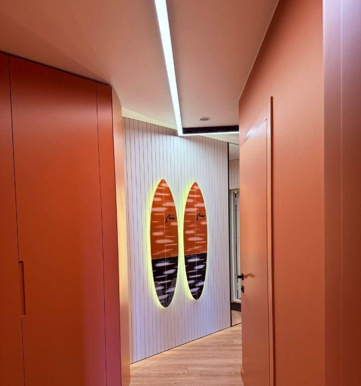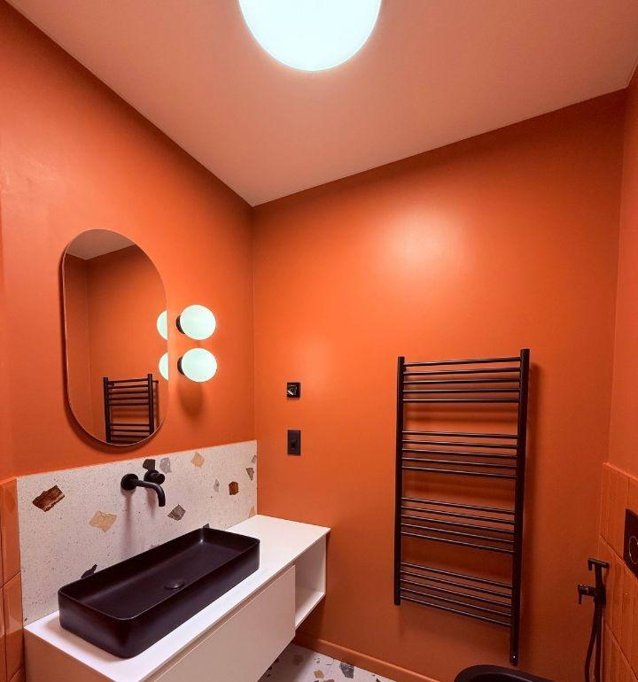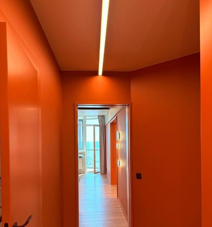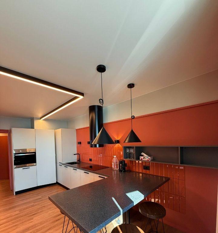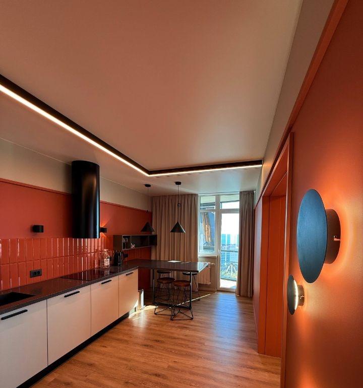 Планировка включает кухню-гостиную и большую жилую комнату (~21 м²). Все работы выполнены качественно: современный интерьер в тёплых тонах, стильное освещение, кондиционер, встроенная мебель.